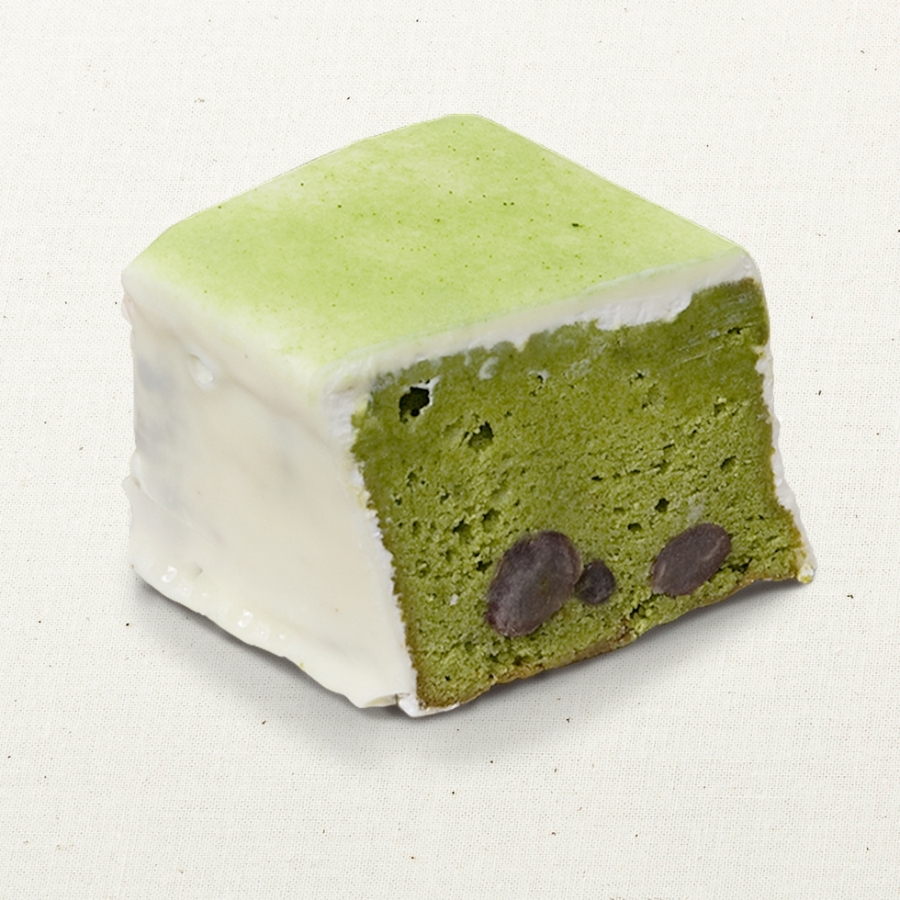 小豆入り抹茶のバターケーキにバタークリームをうすく塗って、ホワイトチョコでコーティング。上面に抹茶パウダーをかけています。